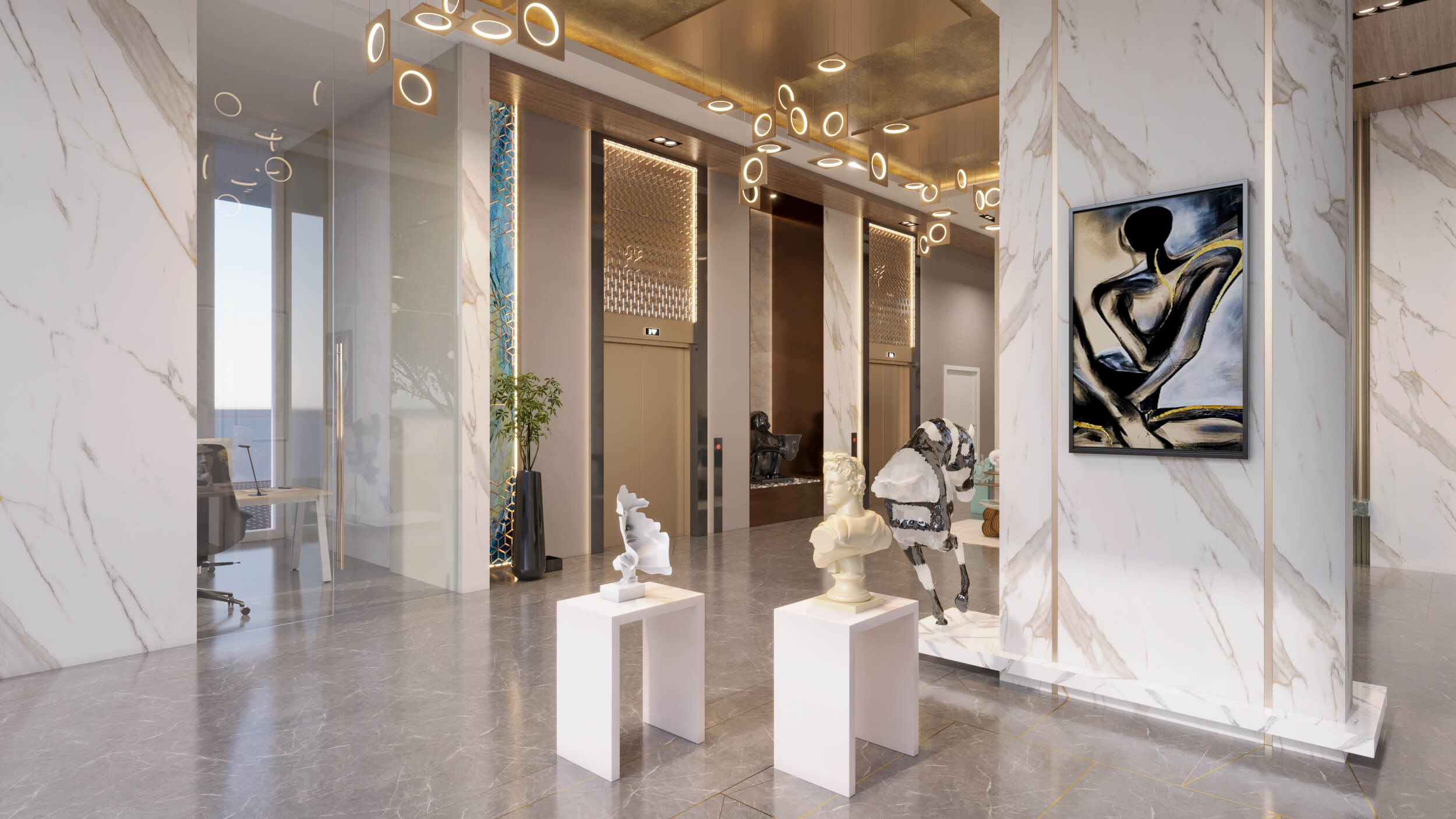 Art is woven into the very fabric of the building, from curated installations in the lobbies and corridors to the panoramic views of the Bandra skyline. Premium Italian marble flooring, designer fixtures, and high-quality fittings elevate the living experience.